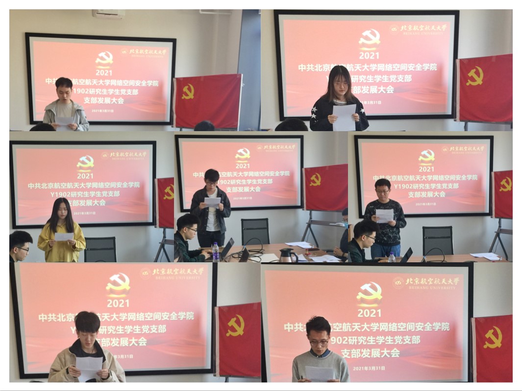 2021年3月31日上午10时,北航太阳集团tyc33455官网Y1902学生党支部在一号馆408会议室召开支部党员发展大会,讨论能否接收曹银浩、韩祎然、刘翔宇、魏晨光、吴礼金、张伟豪、王庆麟7名同志为中共预备党员。本次大会由党支部书记陈晨主持,党建特邀组织员邓彦敏老师、专职组织员王倩云老师、专职辅导员杜逸雯老师列席本次会议。支部党员应到5人,实到5人。